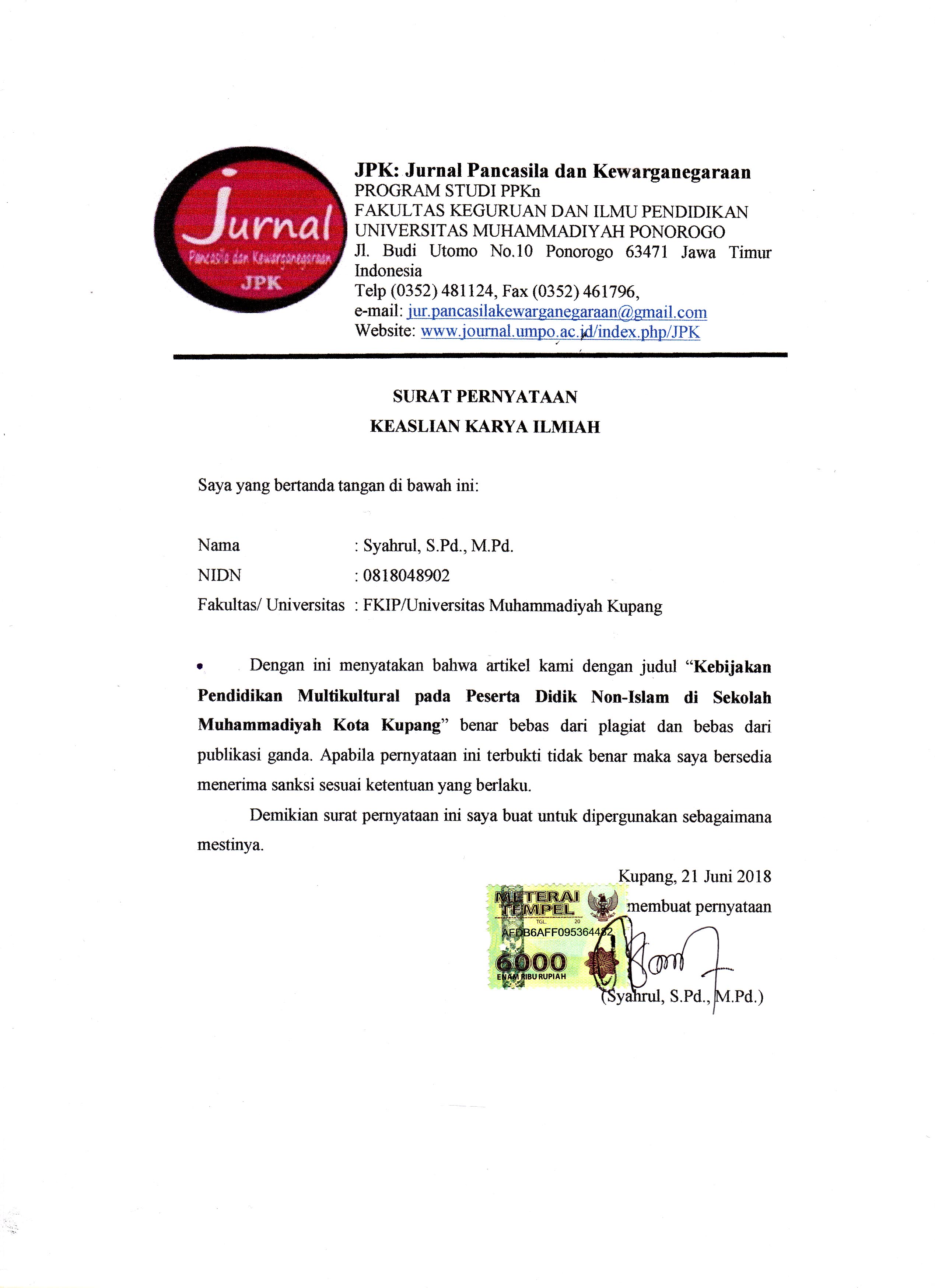 KEBIJAKAN PENDIDIKAN MULTIKULTURAL PADA PESERTA DIDIK NON-ISLAM DI SEKOLAH MUHAMMADIYAH KOTA KUPANG