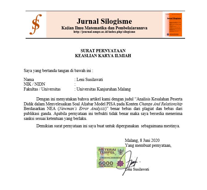 Indahwati, Rohmah. 2017. Analisis Kesalahan Mahasiswa dalam Menyelesaikan Soal Pembuktian Berdasarkan Newman’s Error Analysis (NEA). Jurnal INOVASI, 19 (2): 1-7.